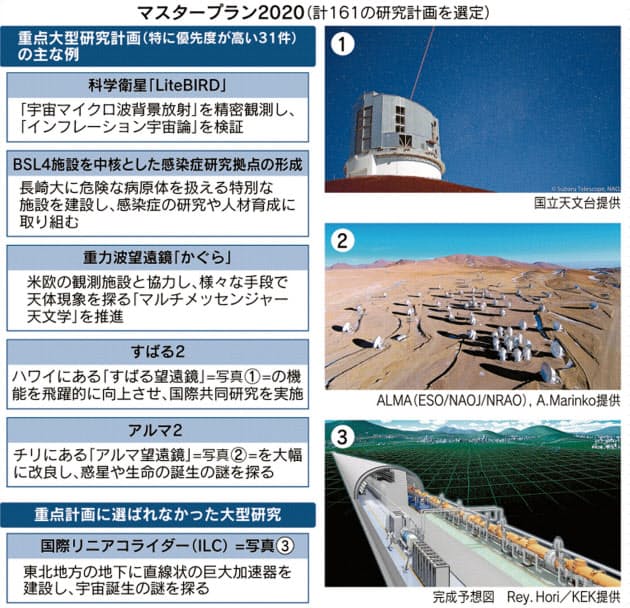 国内の科学者の代表機関である日本学術会議は1月、重要な大型研究プロジェクトをまとめた「マスタープラン2020」を決めた。巨額の予算と長期間を必要とする大型研究計画のうち、学術的な意義が高いものを学術界の意見として取りまとめた。宇宙誕生の謎を探る巨大加速器「国際リニアコライダー(ILC)」は、特に優先順位が高いとされる「重点大型研究計画」には選ばれず、実現への道は険しくなった。