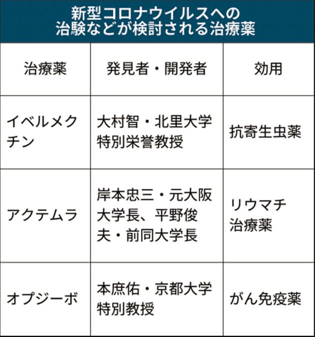 新型コロナウイルスの治療薬として、ノーベル賞などを受賞した日本人研究者の成果に期待が集まっている。北里大学の大村智博士が発見した感染症薬の治験(臨床試験)が国内で始まるほか、大阪大学などが開発したリウマチ薬も効果が報告された。同賞を受賞した京都大学の本庶佑博士らが開発した抗がん剤の臨床研究計画もある。治療薬開発の突破口になるか注目を集める。